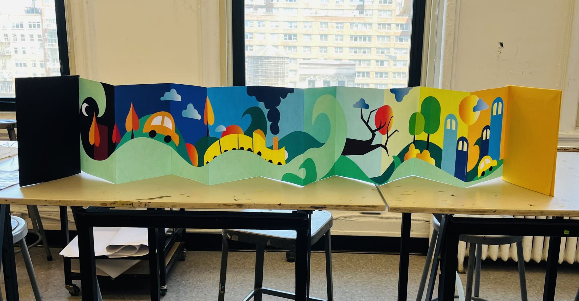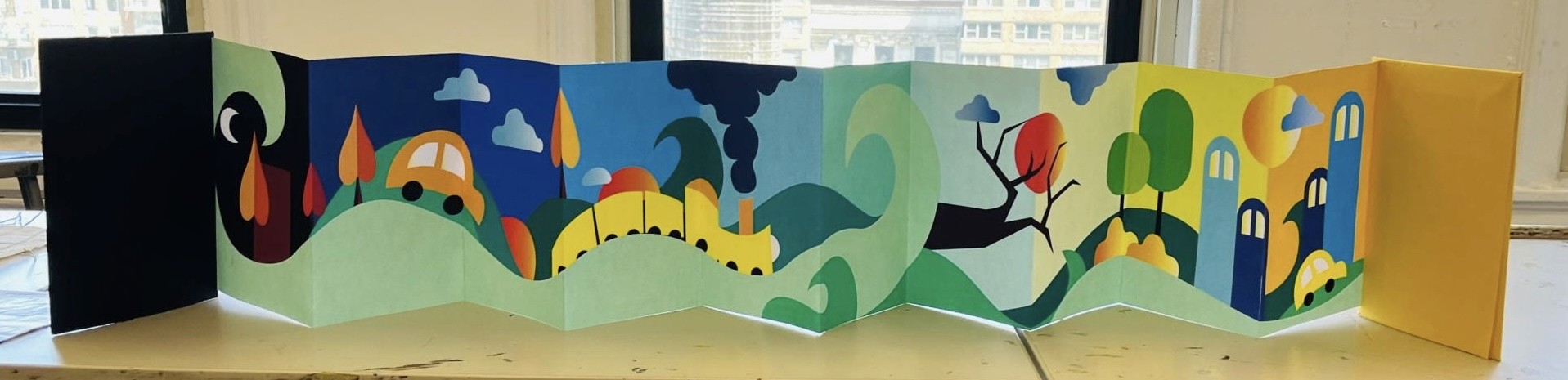 I illustrated an accordion book that showed the early morning 2hr travel from home to school through 10 pages of the book.