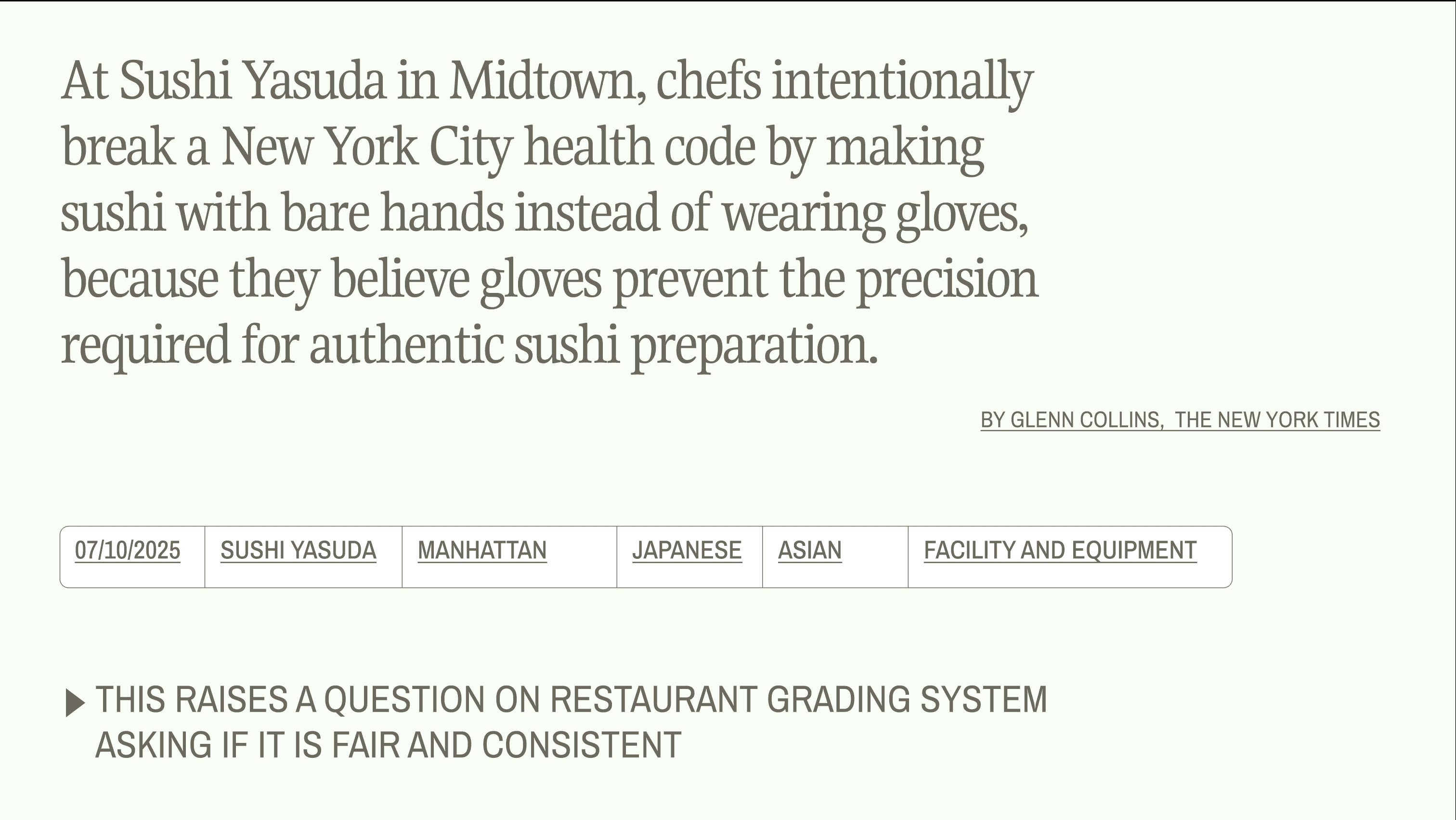 I saw many of my really liked restaurants either not having a NYC grade assigned or a lower grade which made me want to dig deep into to NYC grading data and how it was assigned. I used the data available on the nyc.gov open data site.